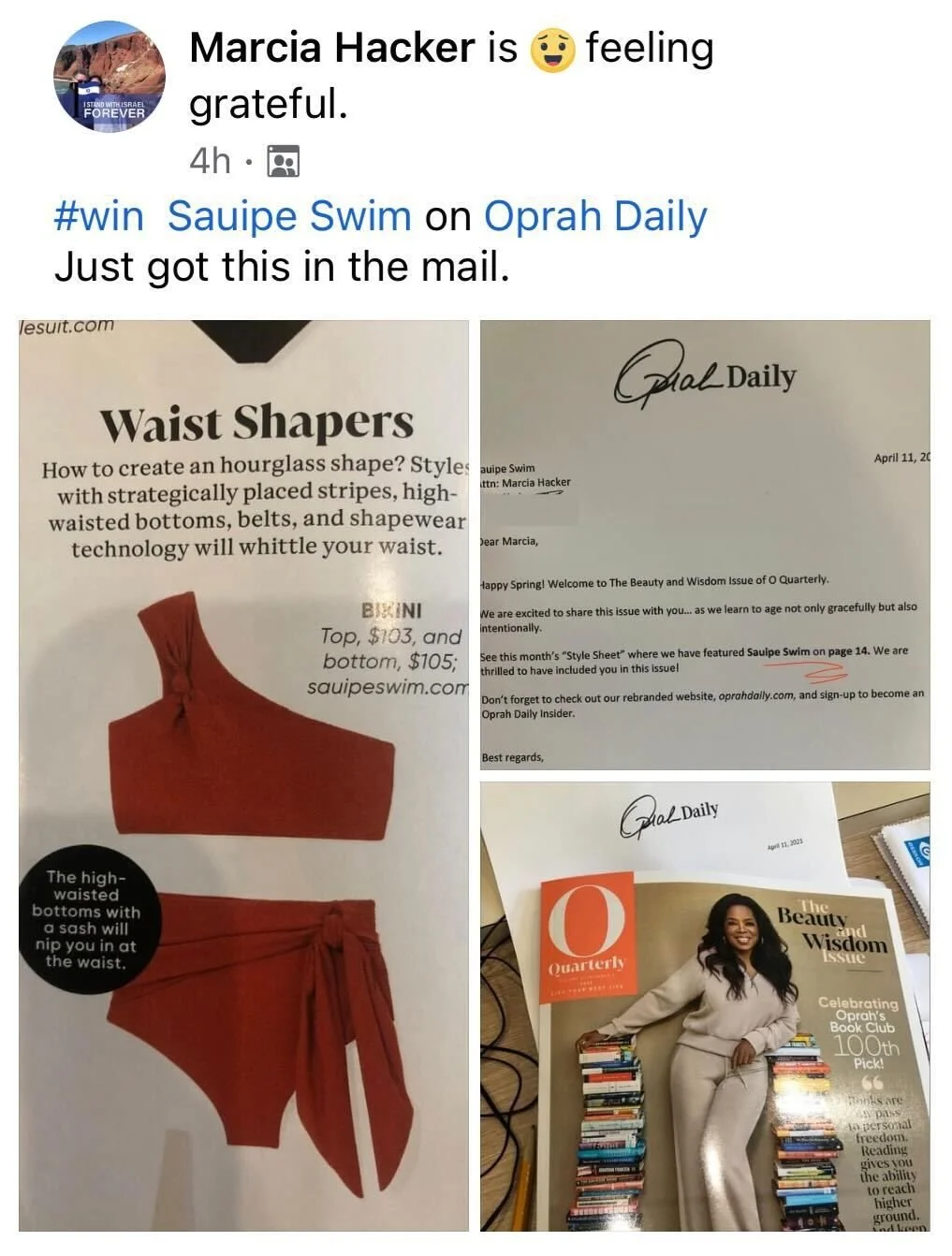 …and instead, carve out 15 minutes each day to develop that winning pitch that you can tweak and send out to multiple media outlets. Leading to your products landing spots in major publications like Vogue, Marie Claire, Oprah Magazine, and more.